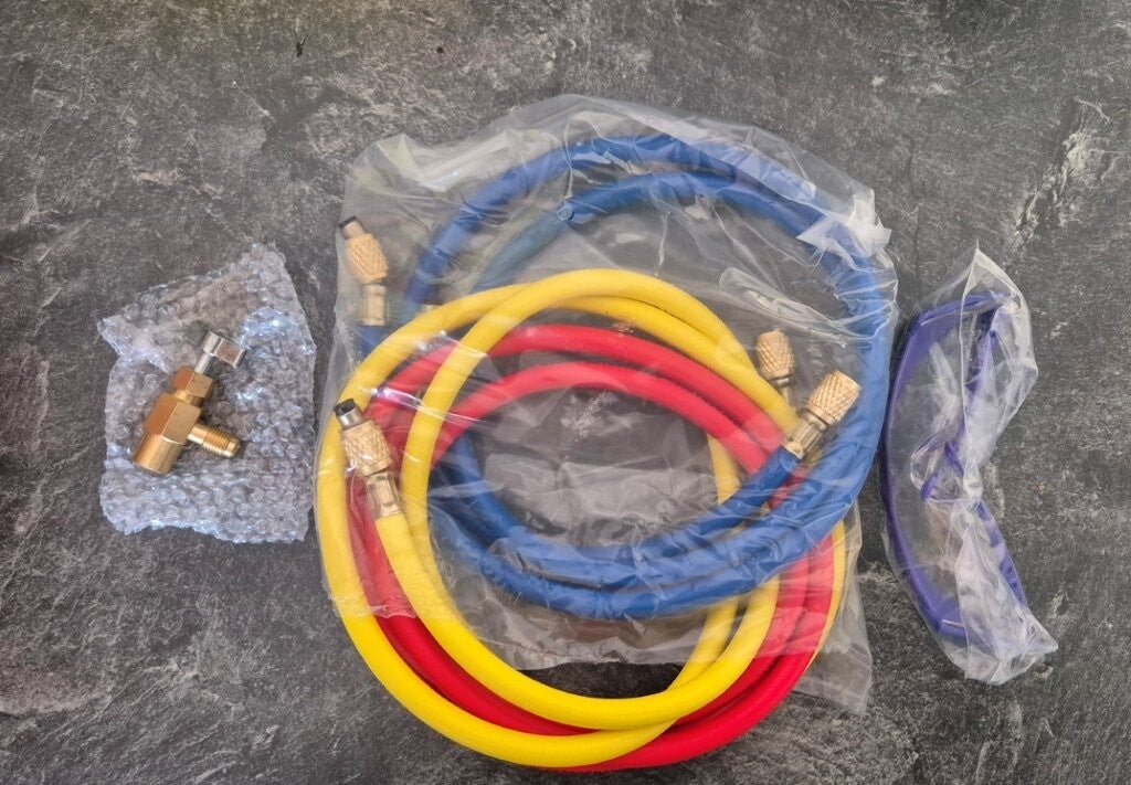 - Drei robuste Schläuche (rot für Hochdruck, blau für Niederdruck, gelb für Vakuum),